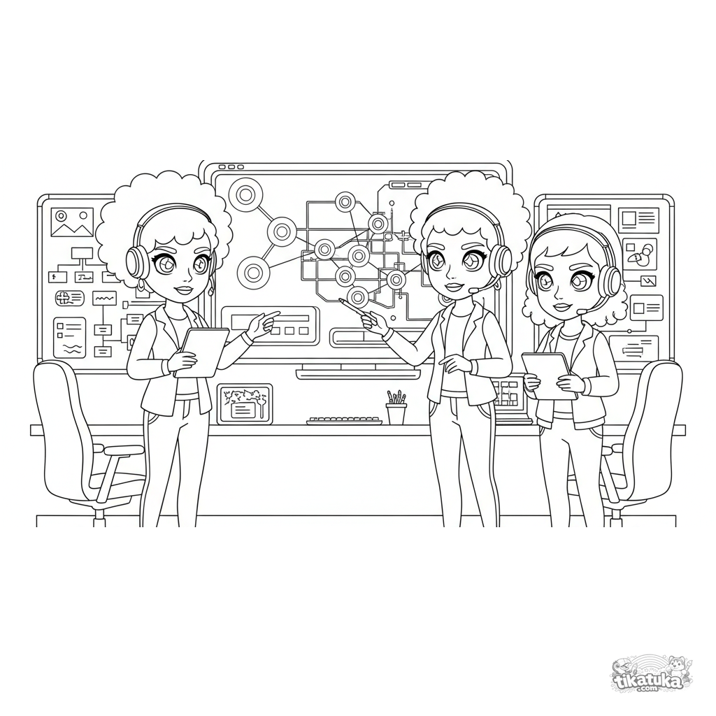 Coloring page: a cybersecurity team plans an operation in a high-tech basement command center. Lots of details: screens, tablets, headsets, diagrams. For kids 10-12.