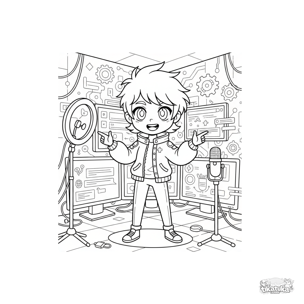 Coloring page for kids 10-12: a streamer in cyberpunk fashion broadcasts from a hacker basement. Details: ring light, microphone, multiple monitors with chat.