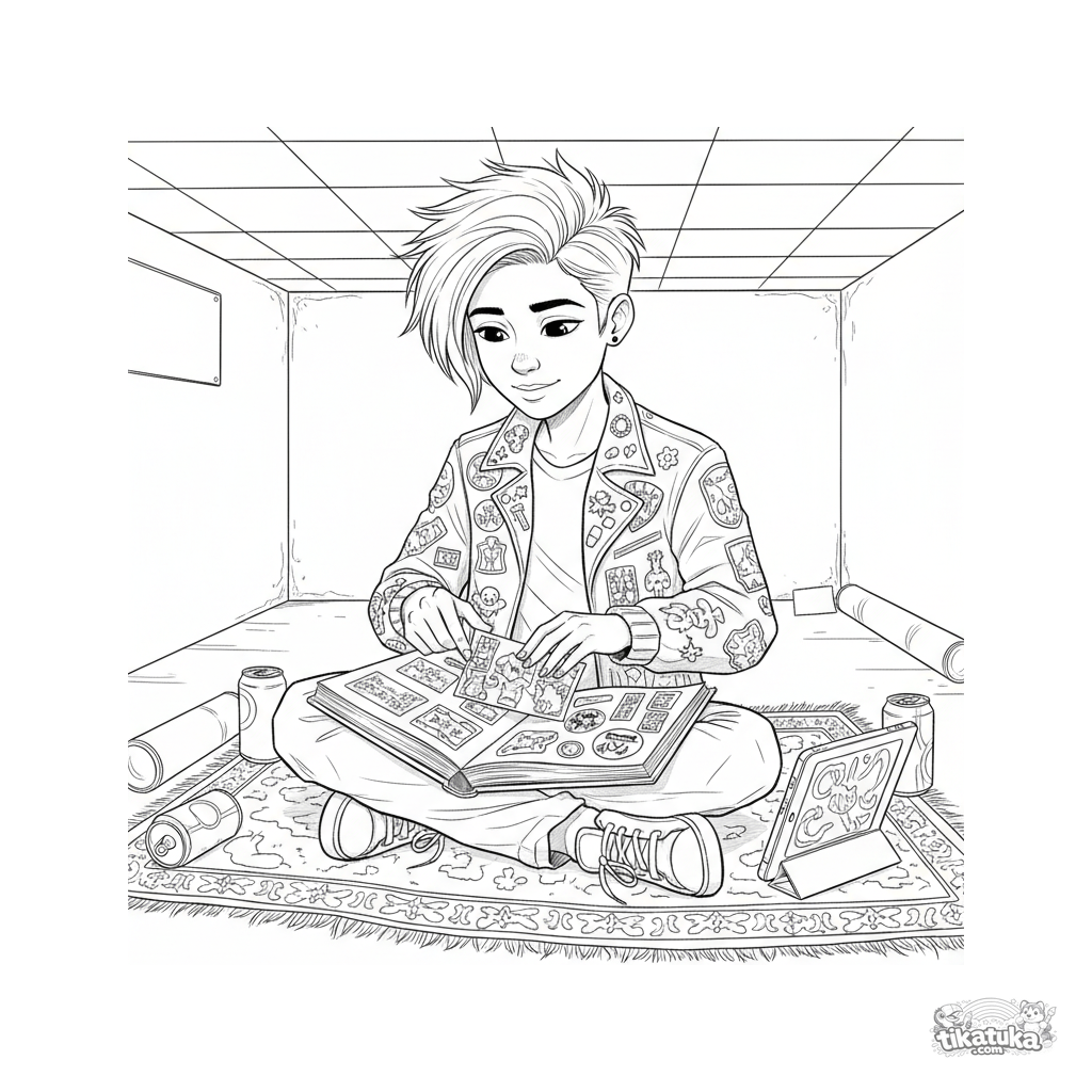 Coloring page for ages 10-12: a teen organizing a sticker collection in a basement hangout. Detailed scene with albums, a tablet, and underground decor elements.