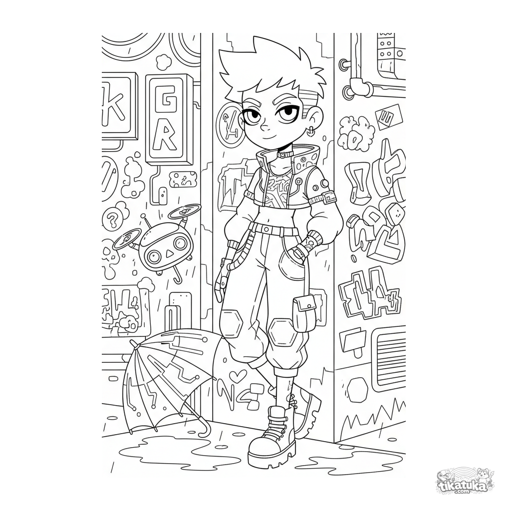 Coloring page for ages 10-12: a detailed cyberpunk street fashion outfit in a neon alleyway. Features high-tech accessories and an urban dystopian background.