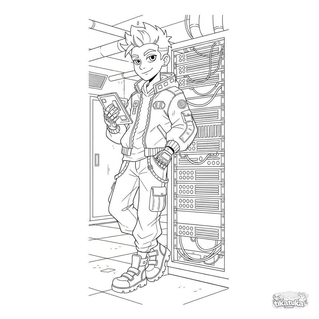Coloring page for kids 10-12: a hacker in cyberpunk attire stands confidently by a glowing server rack in a basement. Detailed scene with fashionable style and tech.