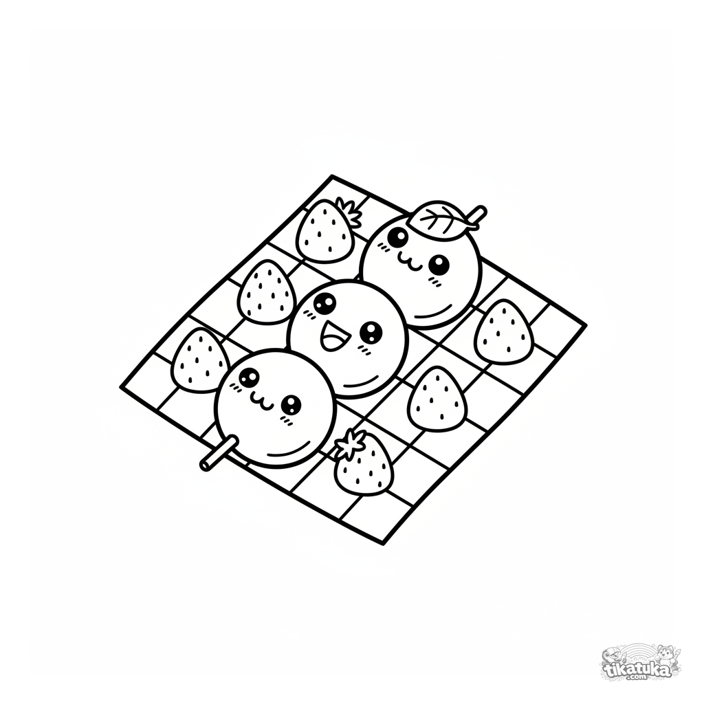 Coloring page for kids 4-6: cheerful dango skewer having a picnic on a checkered blanket among strawberry mochi. Cute faces and simple background.