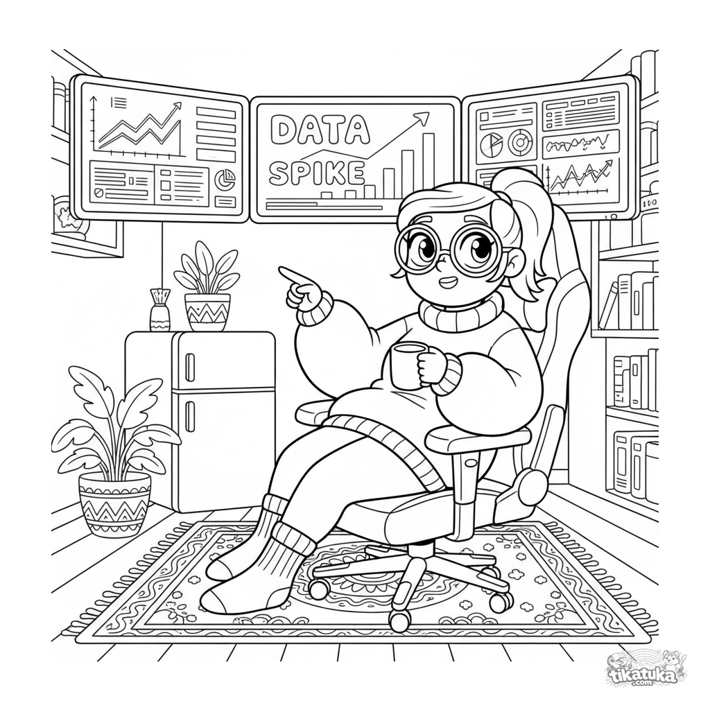 Coloring page for older kids: a data analyst works with graphs on multiple monitors in their cozy basement nook. Scene with high detail of the interior.