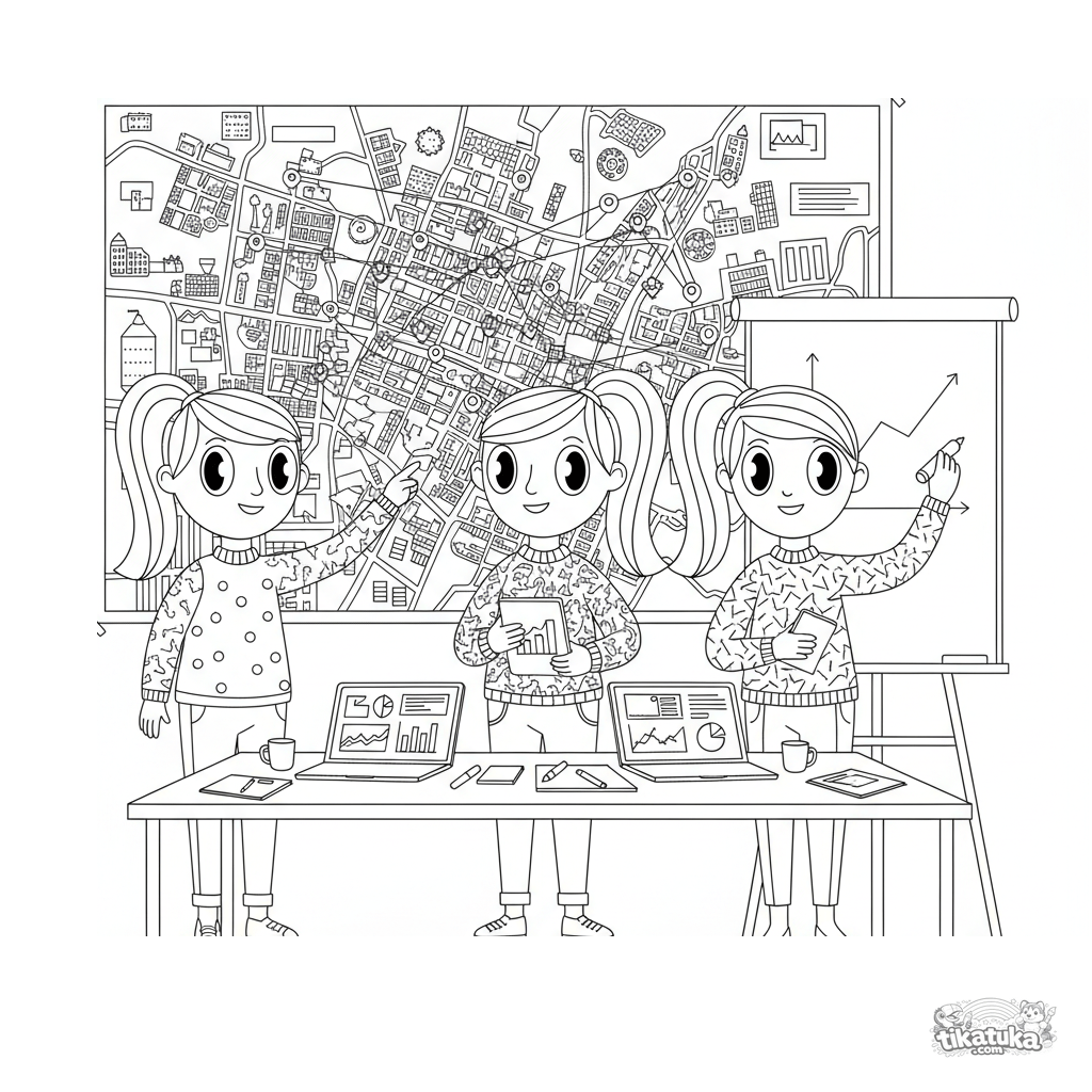 Coloring page for kids 10-12: a hacker team analyzes data while working at a large map wall in a basement, using laptops, tablets, and a whiteboard.
