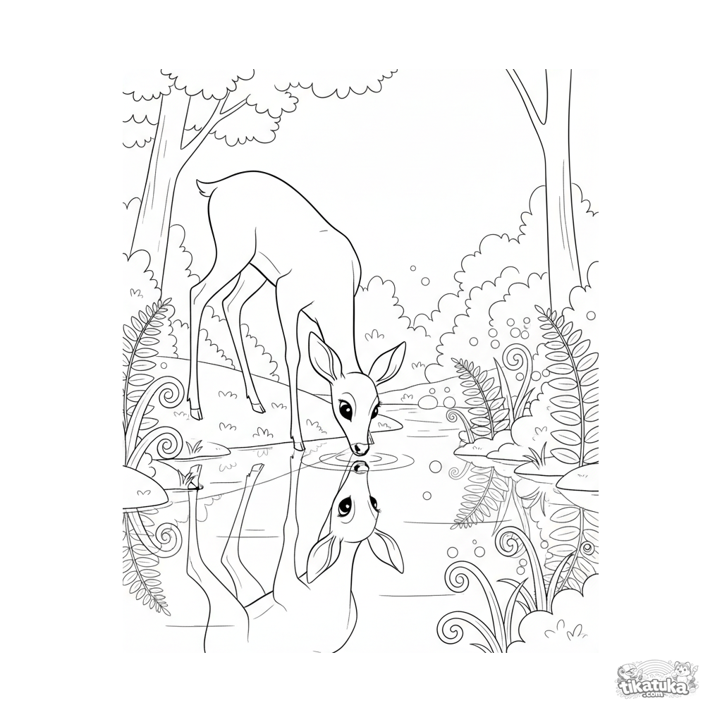 Coloring page for tweens 7-9: a graceful deer drinking from a forest stream at dusk. A scene in a watercolor-sketch style, conveying the calm of evening.
