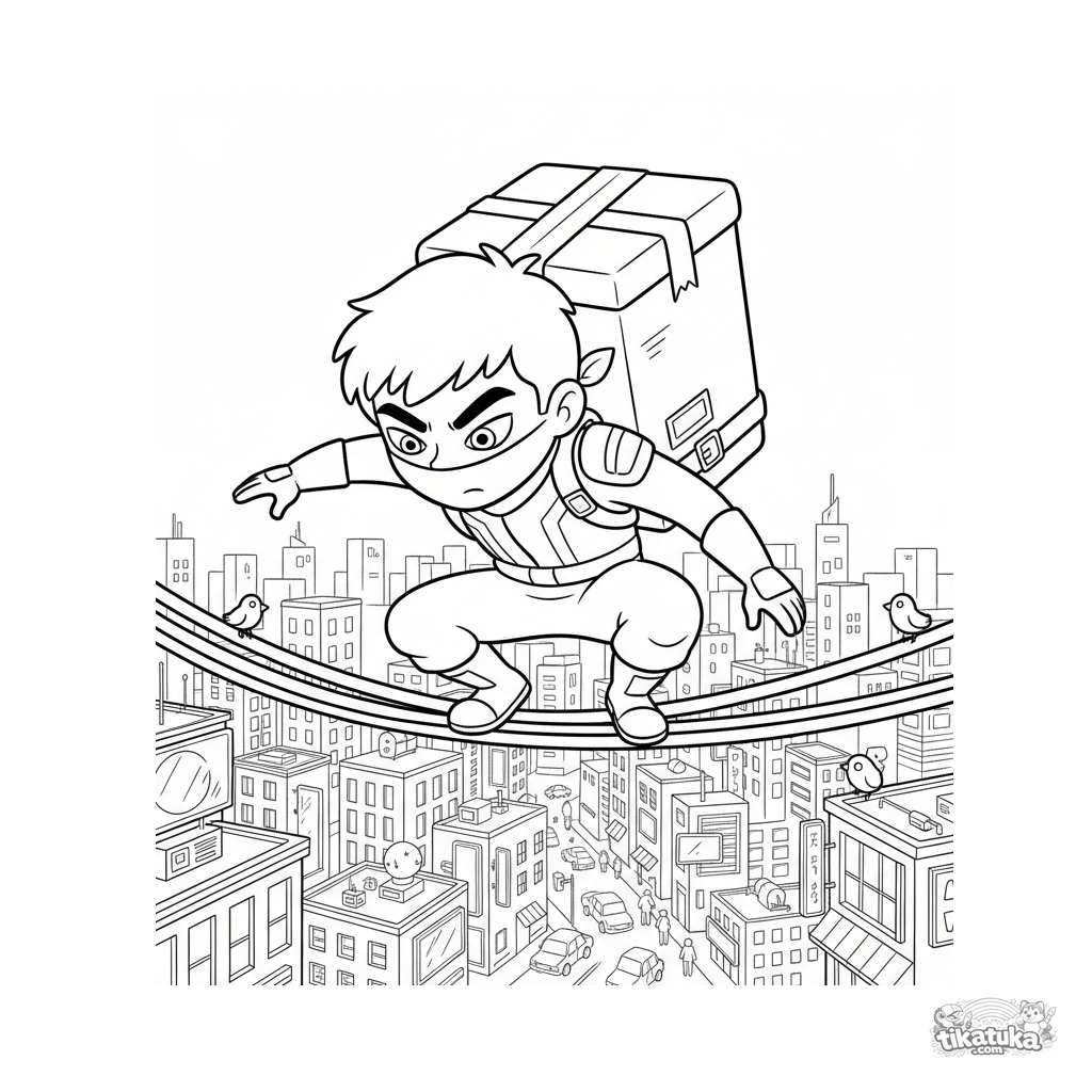Cool action-manga style coloring page: a delivery ninja balances on wires over a neon city at night. A complex urban landscape for older kids aged 10-12.
