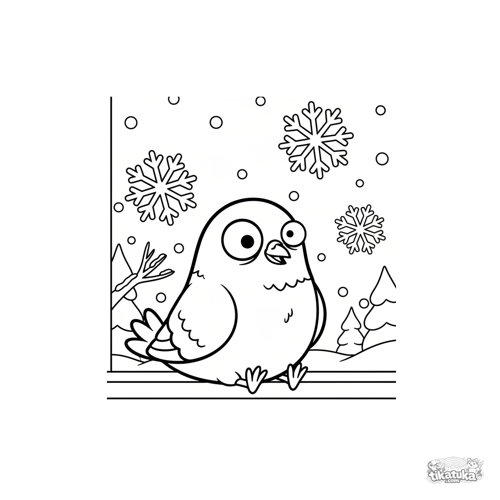 A funny pigeon Arkady watches the first snowfall from a windowsill. Download, print, or color this charming page online!