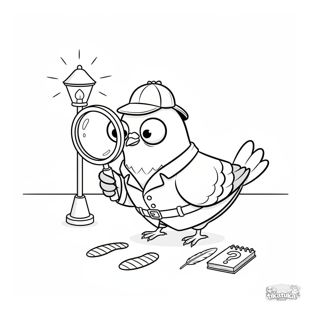 Kids coloring page: a funny derp pigeon detective in a hat and coat examines a footprint with a magnifying glass. Toy style, wide margins, for ages 4-8.