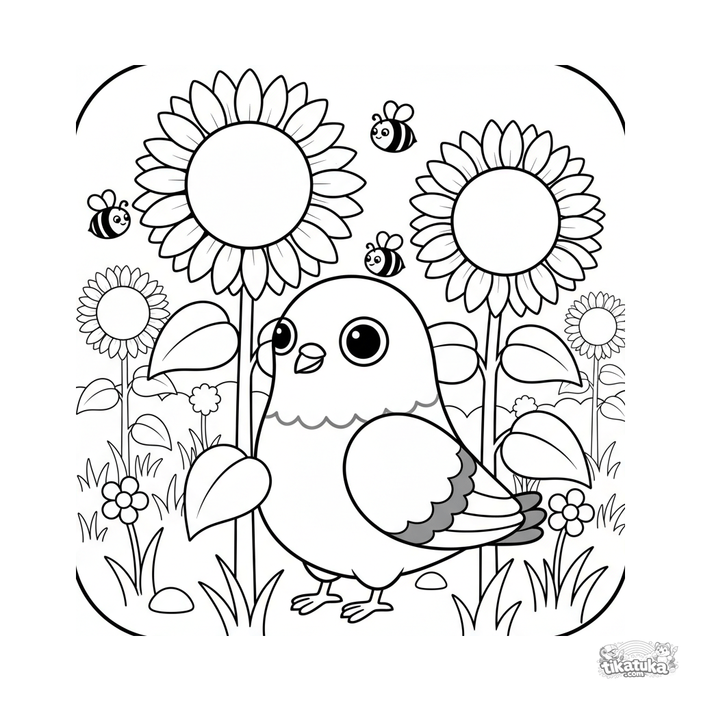 Summer coloring page: a shy pigeon plays hide-and-seek among tall sunflowers. A bright and simple scene for children's creativity.