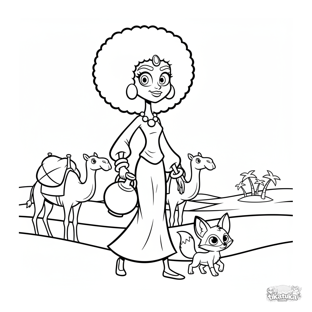 Simple coloring page for toddlers 2-3: a desert princess in silks leads camels across sand dunes towards a palm-tree oasis.