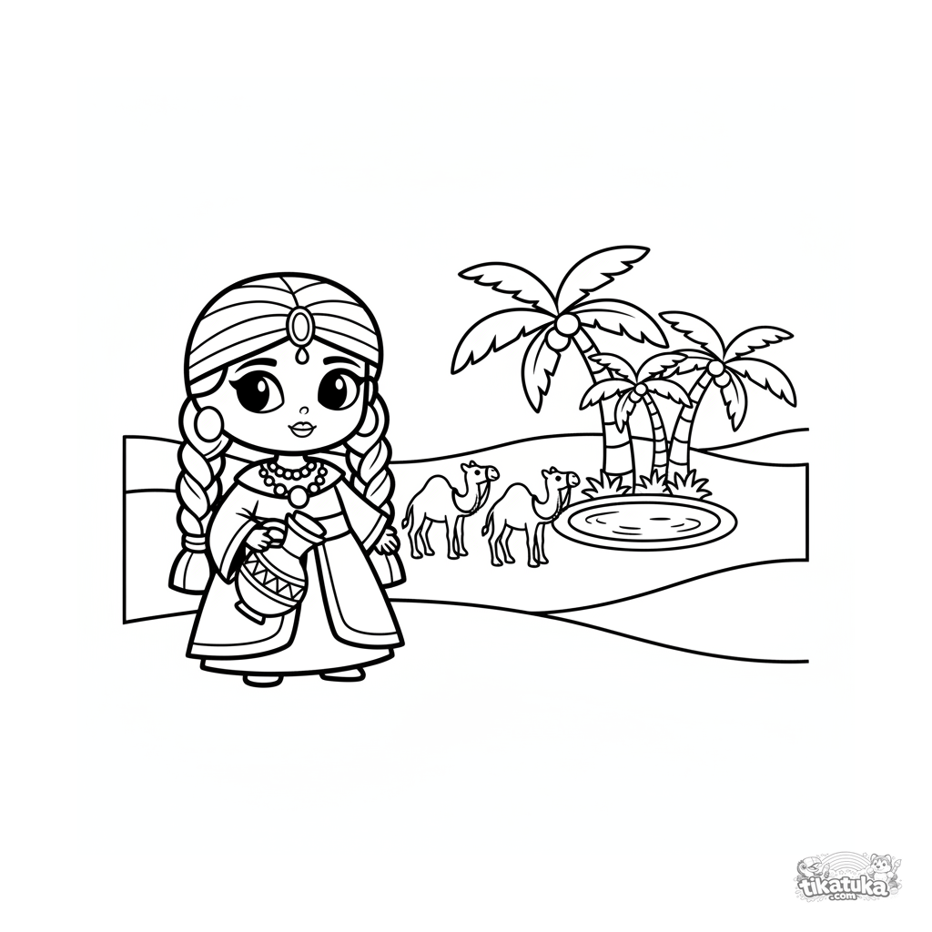 Toddler coloring page 2-3: a desert princess leads camels towards an oasis with palm trees. Simple large shapes, minimal details.