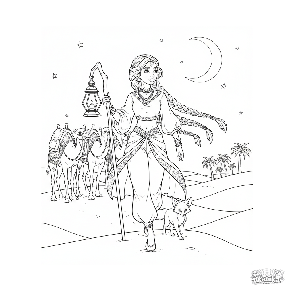 Detailed coloring page for kids 10-12: a desert princess in silks leads a camel caravan through dunes at dusk, with a lantern staff and a desert fox.