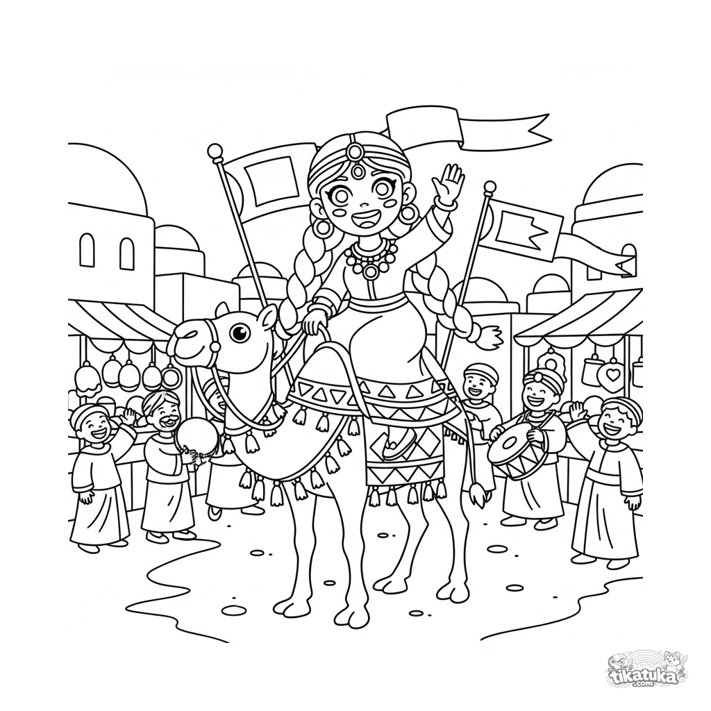 Coloring page for kids 4-6: a desert princess in golden jewelry leads a festival parade on a decorated camel through a sandy market town.