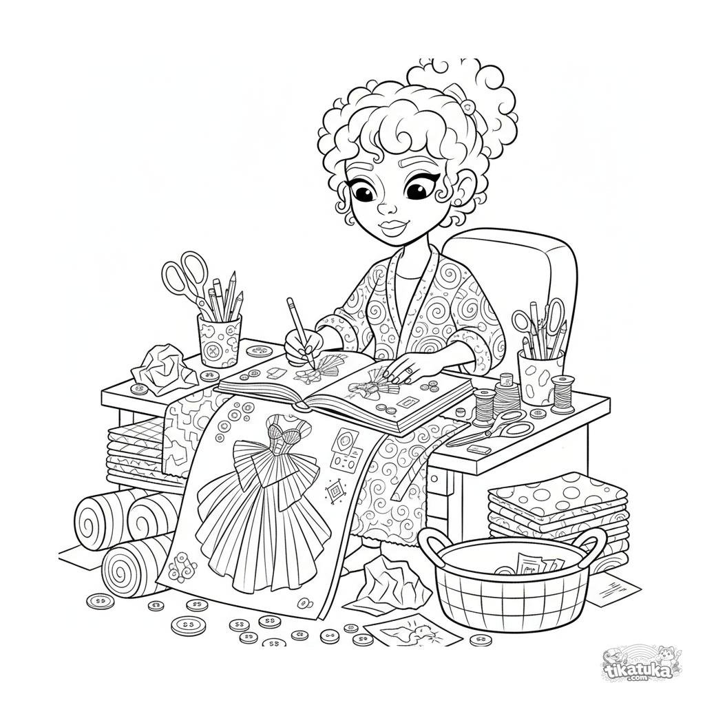 Coloring page for girls 10-12: a fashion designer intently sketches a complex avant-garde dress at a messy desk, surrounded by fabric swatches and drawing tools.