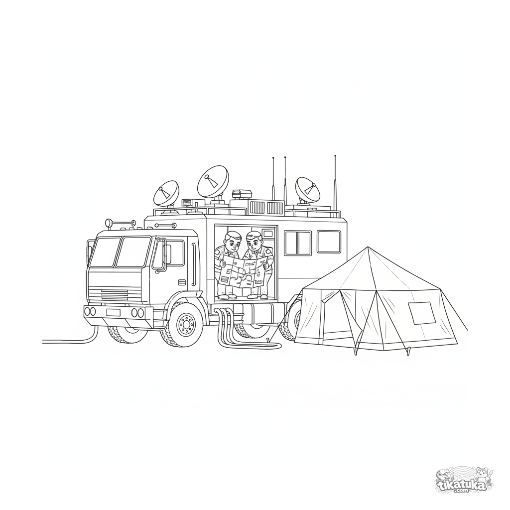 Detailed coloring page for older kids 10-12: a intricate command post truck with many antennas in a field camp.