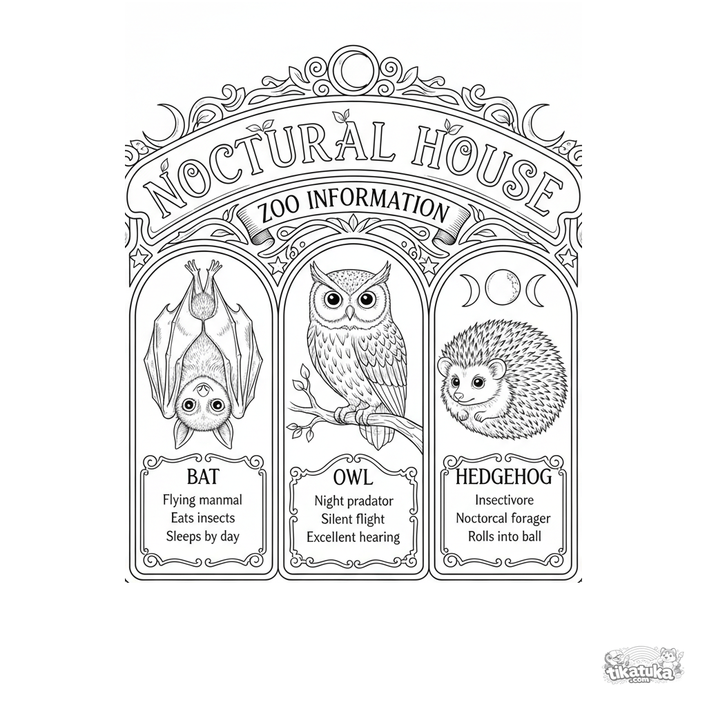 Complex coloring page for kids 10-12: a detailed illustration of a 'Nocturnal House' zoo information sign in a vintage engraving style. Features a bat, owl, and hedgehog.