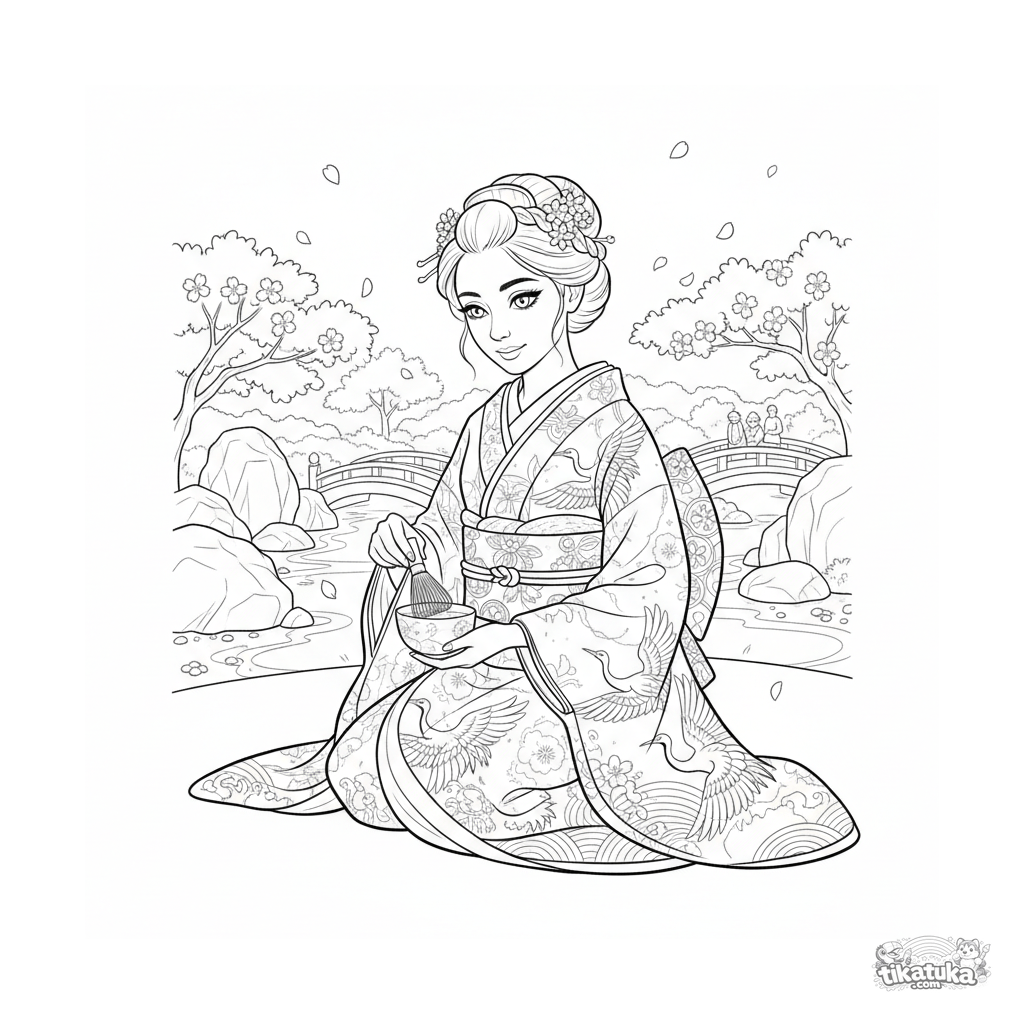 Complex coloring page for girls: a figure in a detailed crane-pattern kimono participates in a tea ceremony in a Japanese garden. Full scene, wide margins, for ages 10-12.