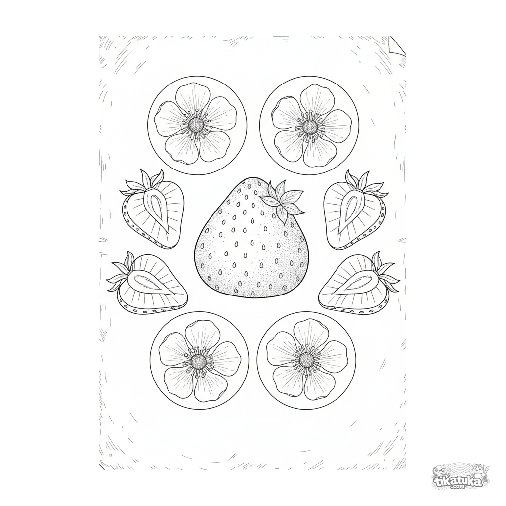 Intricate coloring page in vintage botanical illustration style. Detailed depiction of a strawberry mochi with flower diagrams for kids 10-12.