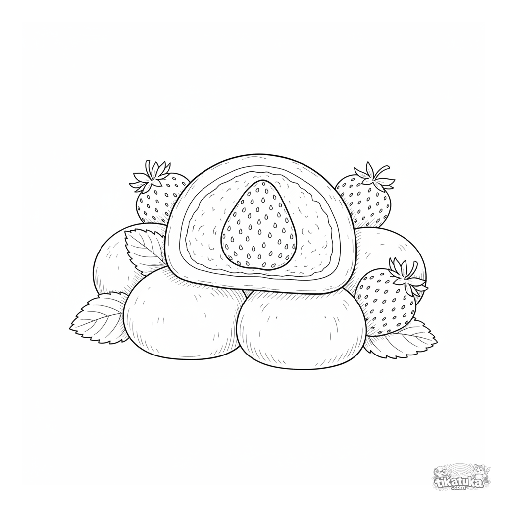 Complex coloring page for older kids 10-12: a realistic cross-section of a strawberry mochi showing bean paste and strawberry filling. Detailed illustration in a popular science style.