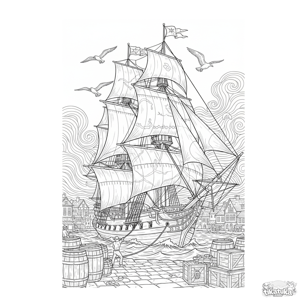 Complex coloring page for older kids 10-12: a detailed tall ship arrives at harbor at sunset. Many rigging elements and background for patient coloring.