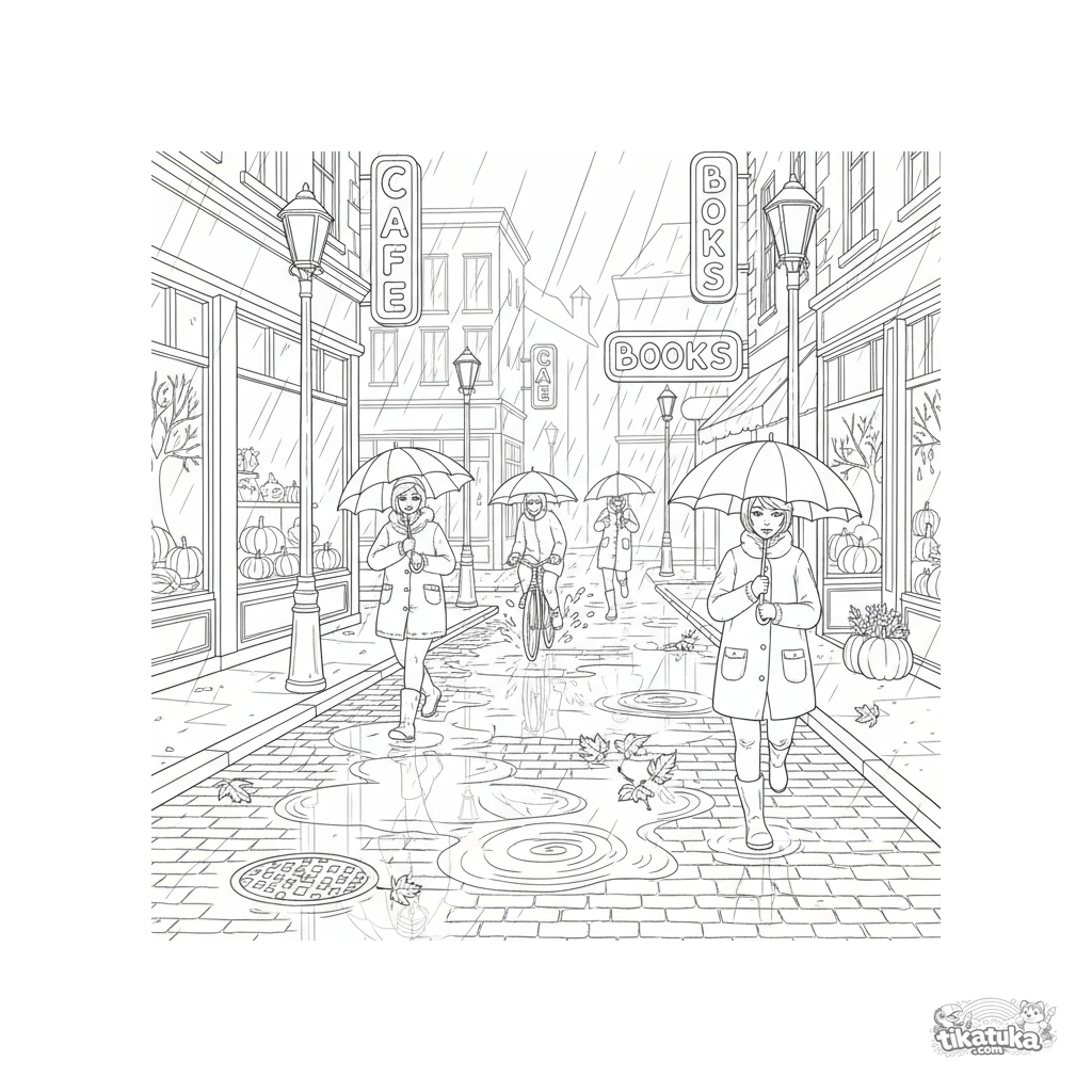Complex coloring page for older kids 10-12 years: a detailed scene of a city street on a rainy autumn evening with reflections in puddles, people under umbrellas, and shop windows.
