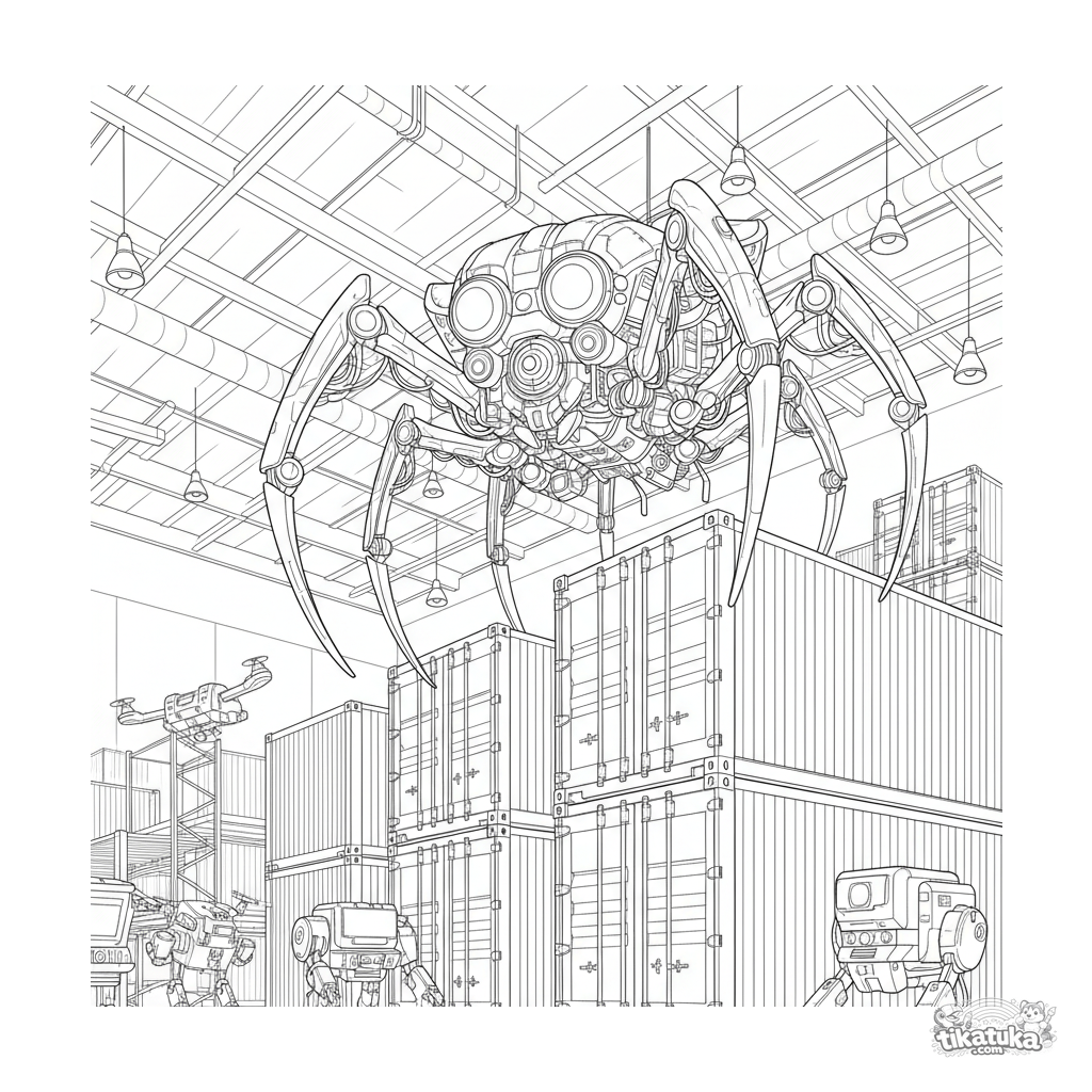 Complex coloring page for older kids 10-12: a detailed spider-bot with multiple cameras and legs surveys a warehouse from atop containers. Drones buzz below. High level of detail.