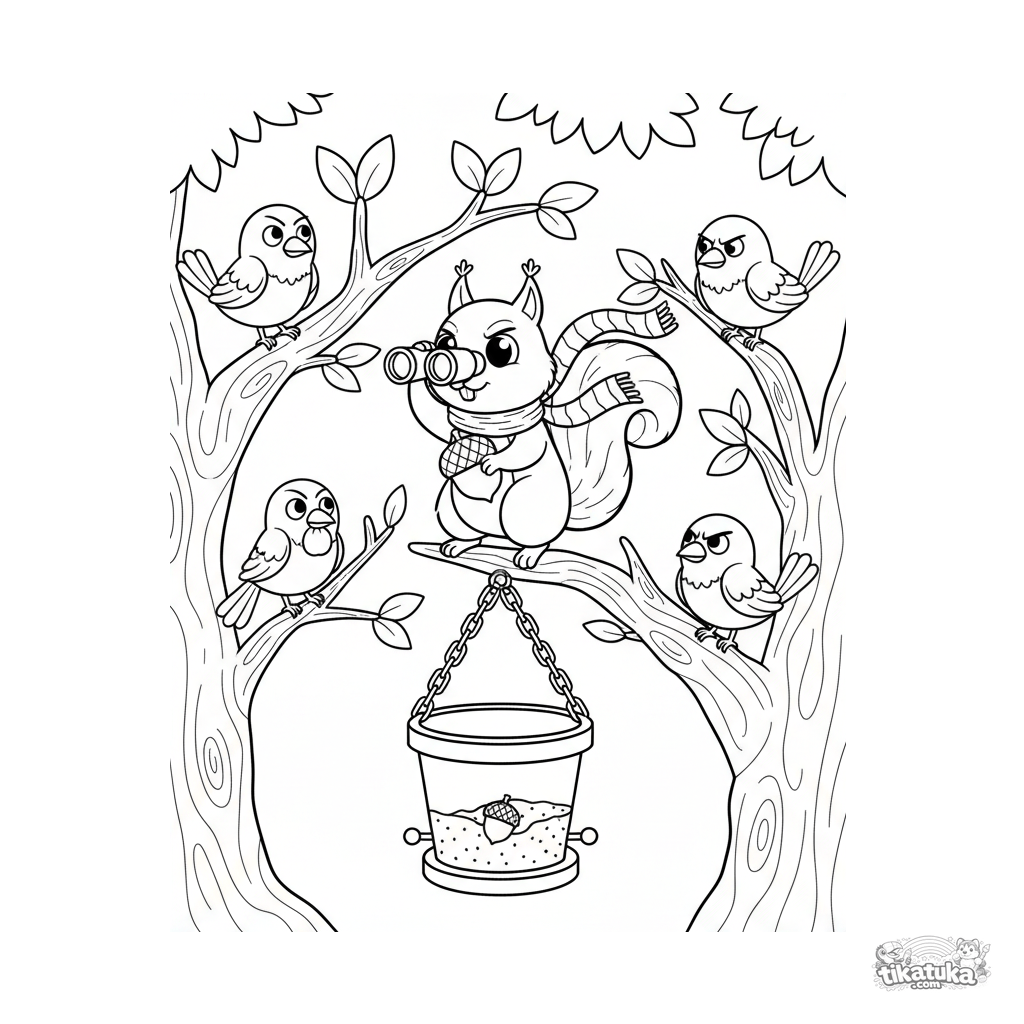 Coloring page for kids 10-12: a determined squirrel with a scarf on a bird feeder, using tiny binoculars to scout for nuts, while birds look on annoyed. Funny meme.
