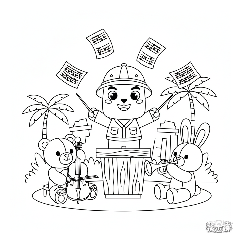 Coloring page for kids 4-6: the dino explorer hero conducts a plush toy orchestra from a small podium, with sheet music floating around him.