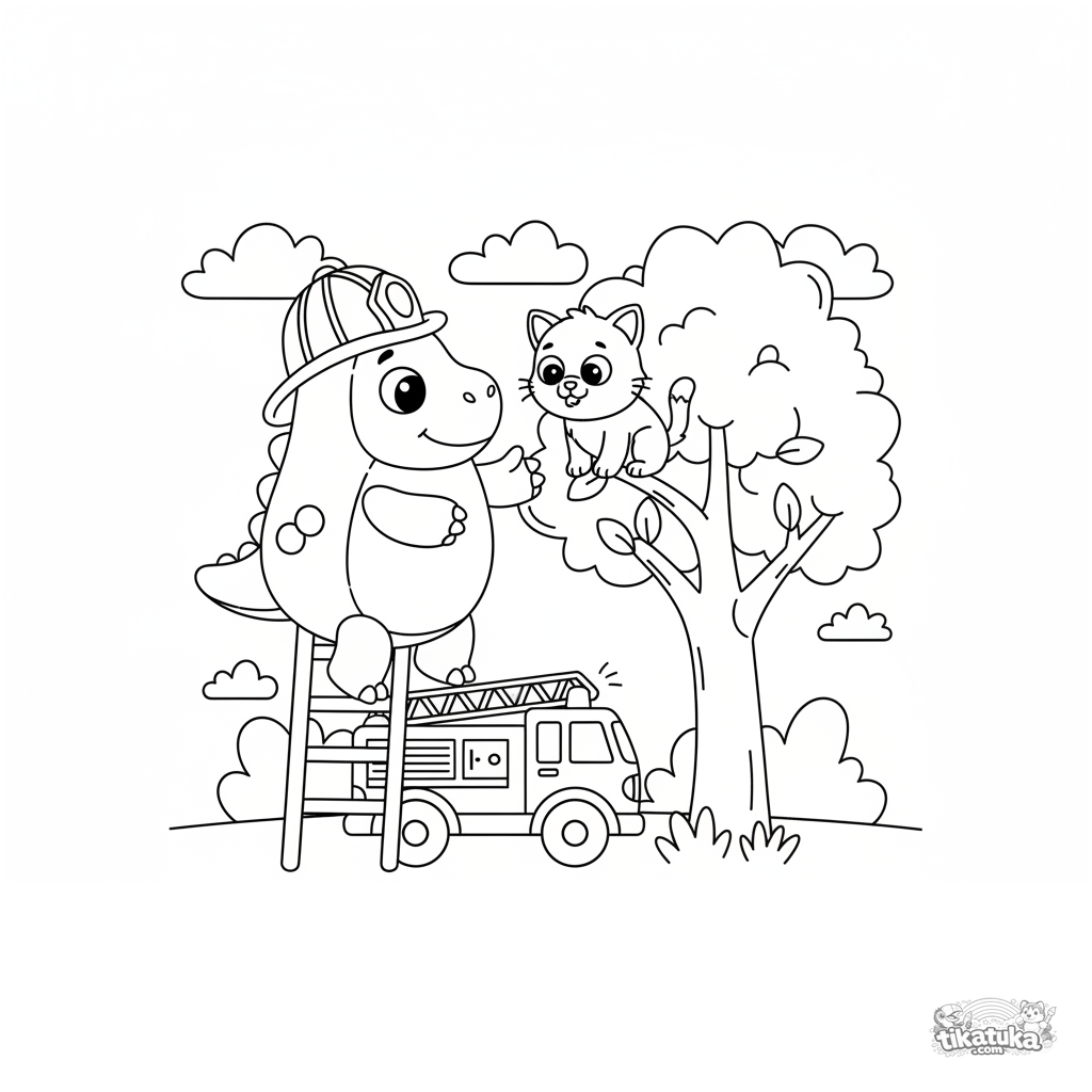 Coloring page for kids 4-6: the dino explorer hero in a firefighter helmet climbs a tree ladder to rescue a scared kitten, with a friendly fire truck below.