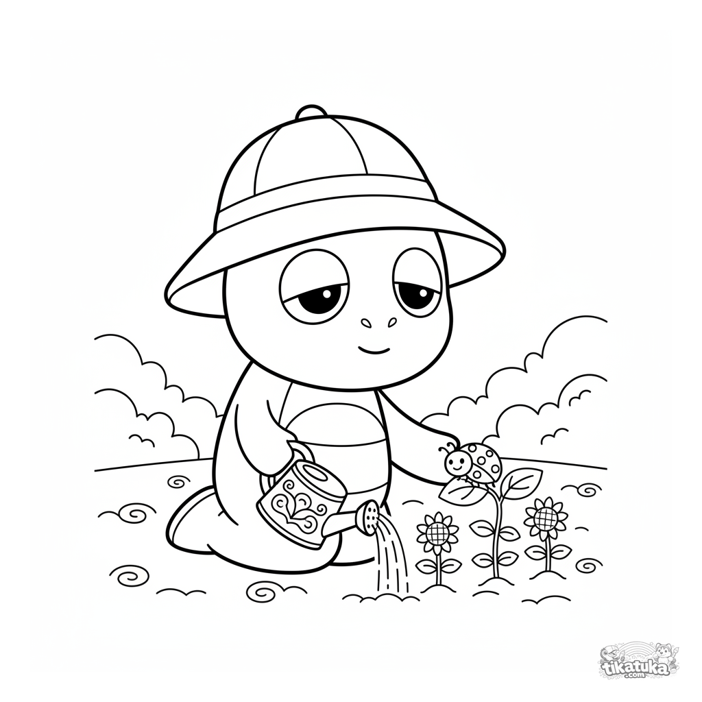 Coloring page for kids 4-6: the dino explorer hero in a gardening hat waters tiny sunflower seedlings with a watering can, a ladybug crawls nearby.