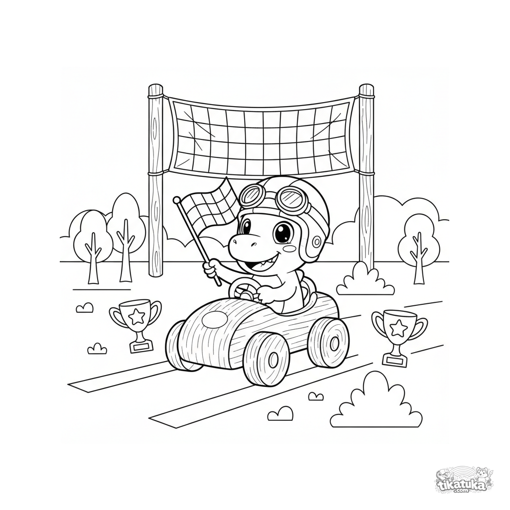Coloring page of a dino explorer race car driver celebrating victory in a toy race car. For boys 4-6 years old, a dynamic and joyful scene.