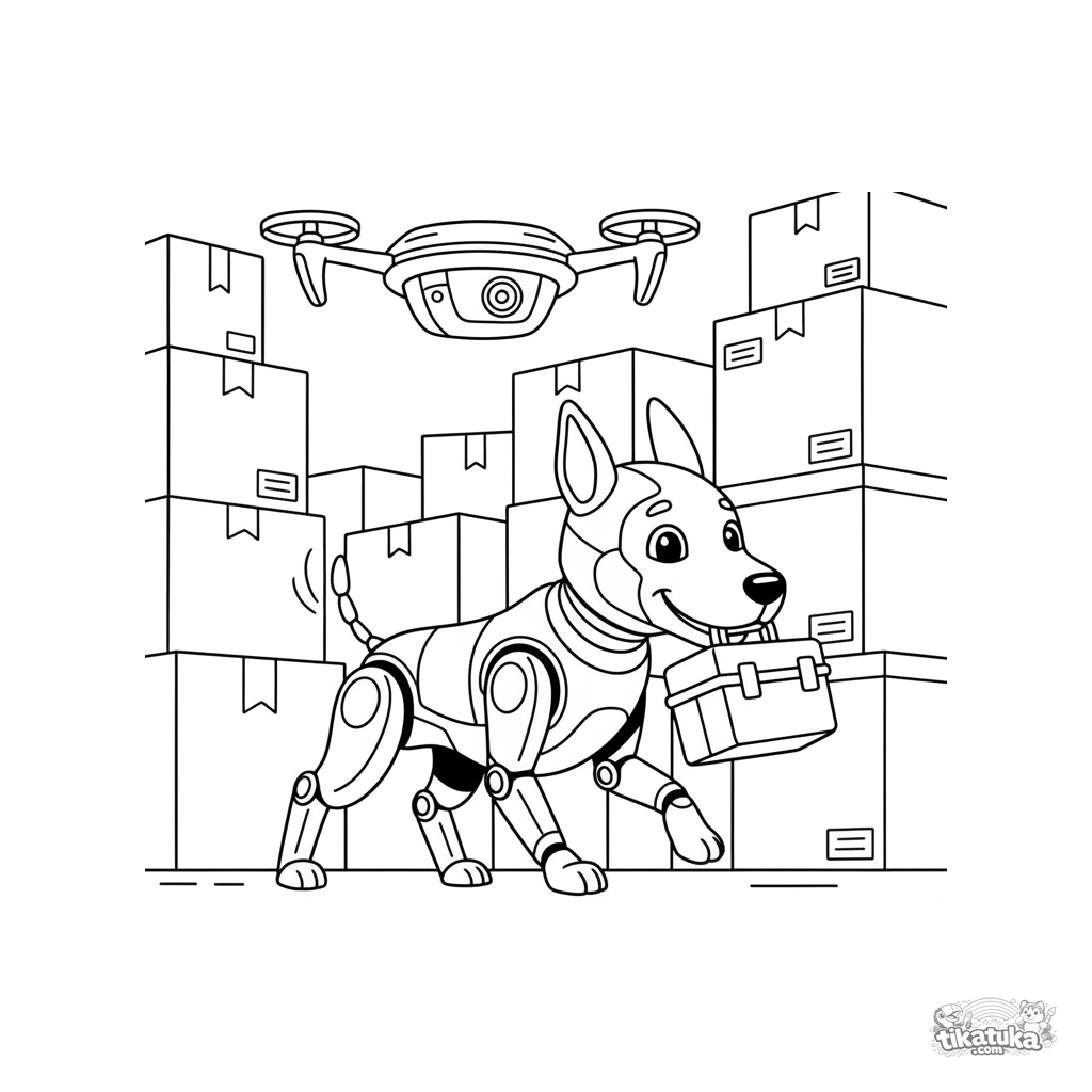 Kids coloring page for ages 4-6: a robotic dog carrying a toolbox in its mouth trots down a warehouse aisle, navigating around boxes. Moderate detail, clear outlines.
