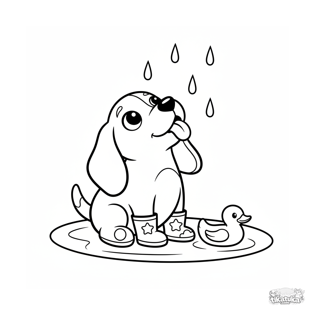 Coloring page for toddlers 2-3 years: a cheerful puppy in tiny boots sits in a puddle catching raindrops with its tongue. Very simple and large shapes.
