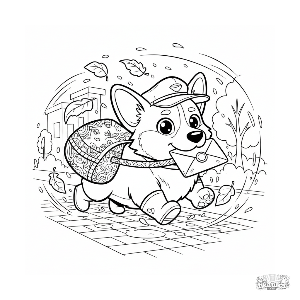 Coloring page for older kids 10-12 years: a determined corgi mail carrier in boots and cap hurries to deliver a letter in an autumn rainstorm. Dynamic scene with high detail.