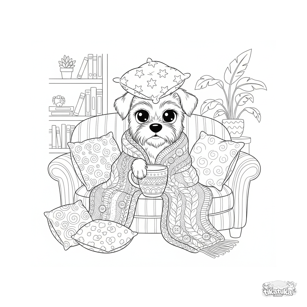 Coloring page for kids 7-12: a small dog is hilariously tangled in a blanket on a living room couch. A chaotic and funny scene of failure.