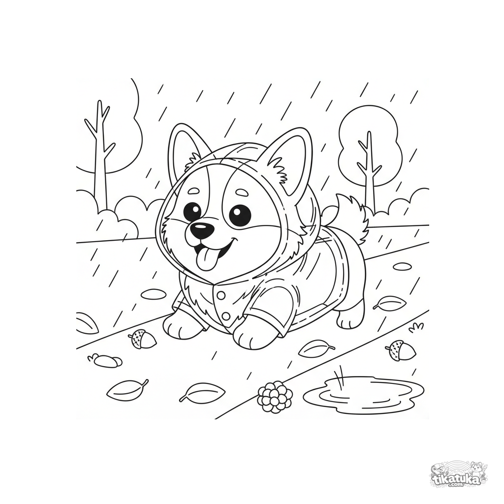 Coloring page for kids 4-6 years: a fluffy corgi in a raincoat walks in an autumn park. Moderate detail, clear shapes, cute scene.