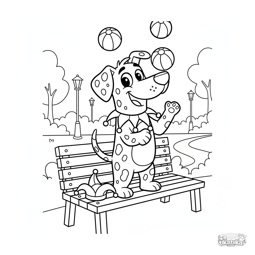 Coloring page for kids 4-6: a playful spotted dog juggles balls while standing on a park bench. A dynamic and funny scene for coloring.