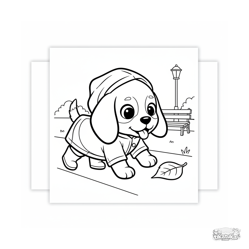 Simple coloring page for toddlers 2-3: a cute puppy in a raincoat and boots walks on an autumn path. Large shapes, thick outlines, perfect for first crayons.