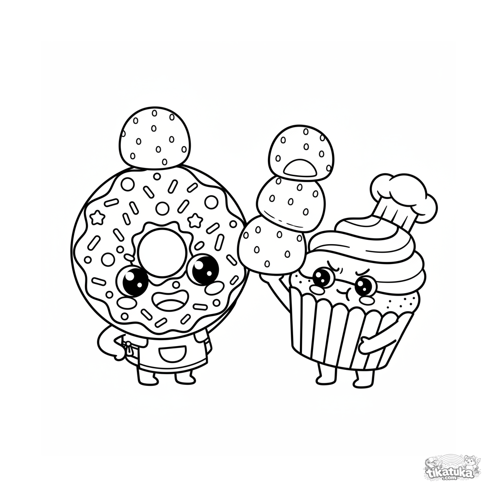 Detailed coloring page for older kids 10-12: a donut and cupcake build a tower of strawberry mochi on a picnic. Lots of details and interactions.