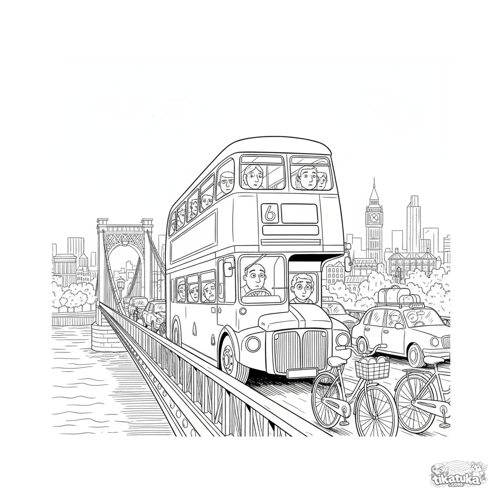 Detailed coloring page of a double-decker bus in traffic on a city bridge. For older kids 10-12. Many windows, passengers, urban scenery.