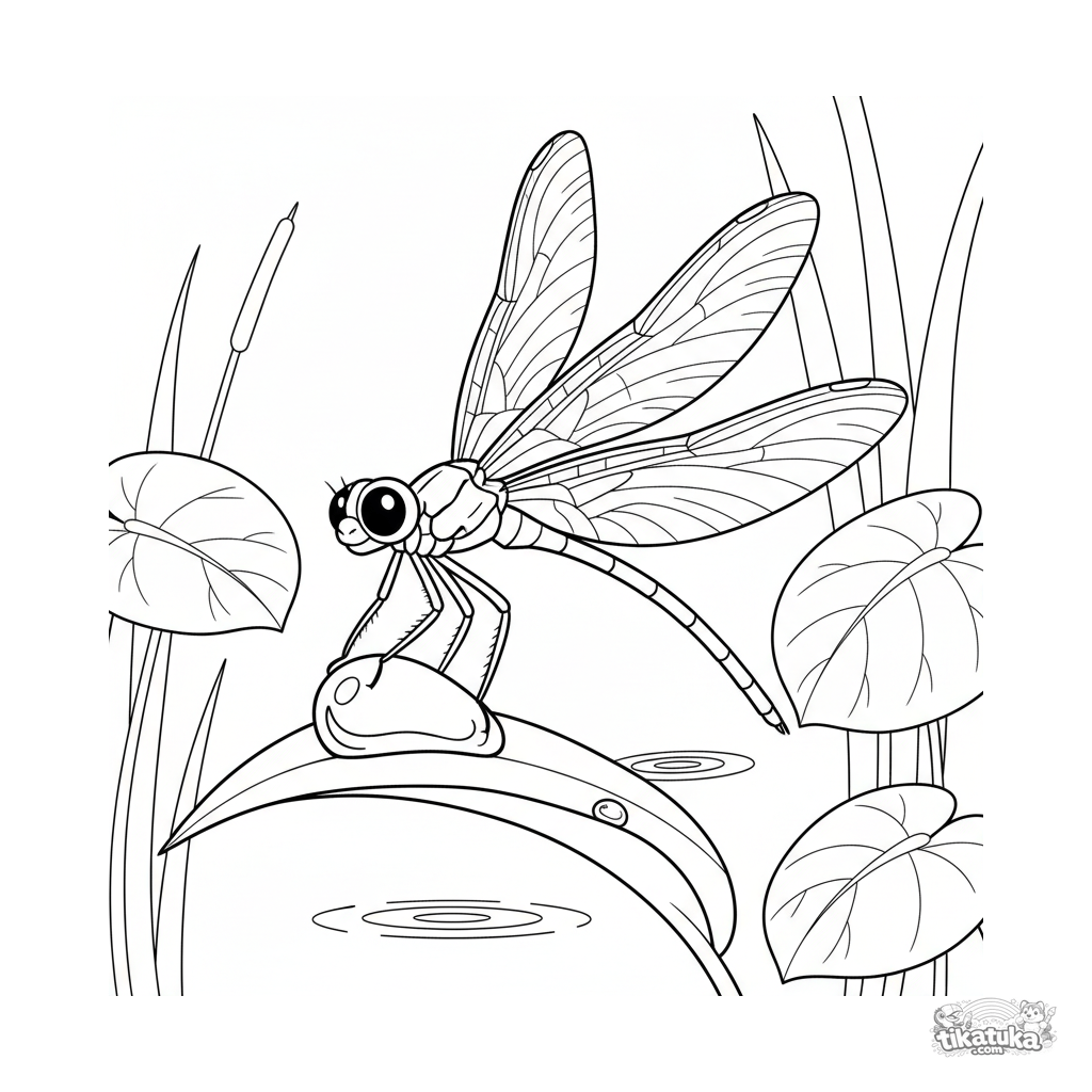 Coloring page for kids 4-6: a graceful dragonfly balances on a round dewdrop on a large leaf. Clear outlines and recognizable insect form.