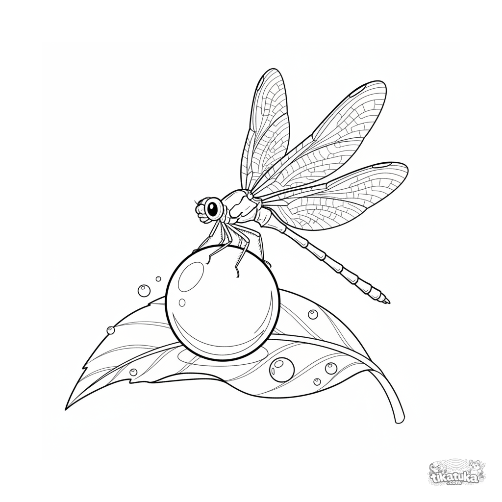 Detailed coloring page for kids 10-12: a dragonfly with patterned wings perches on a perfect dewdrop on a leaf. Realistic lines, plenty of details for creative coloring.