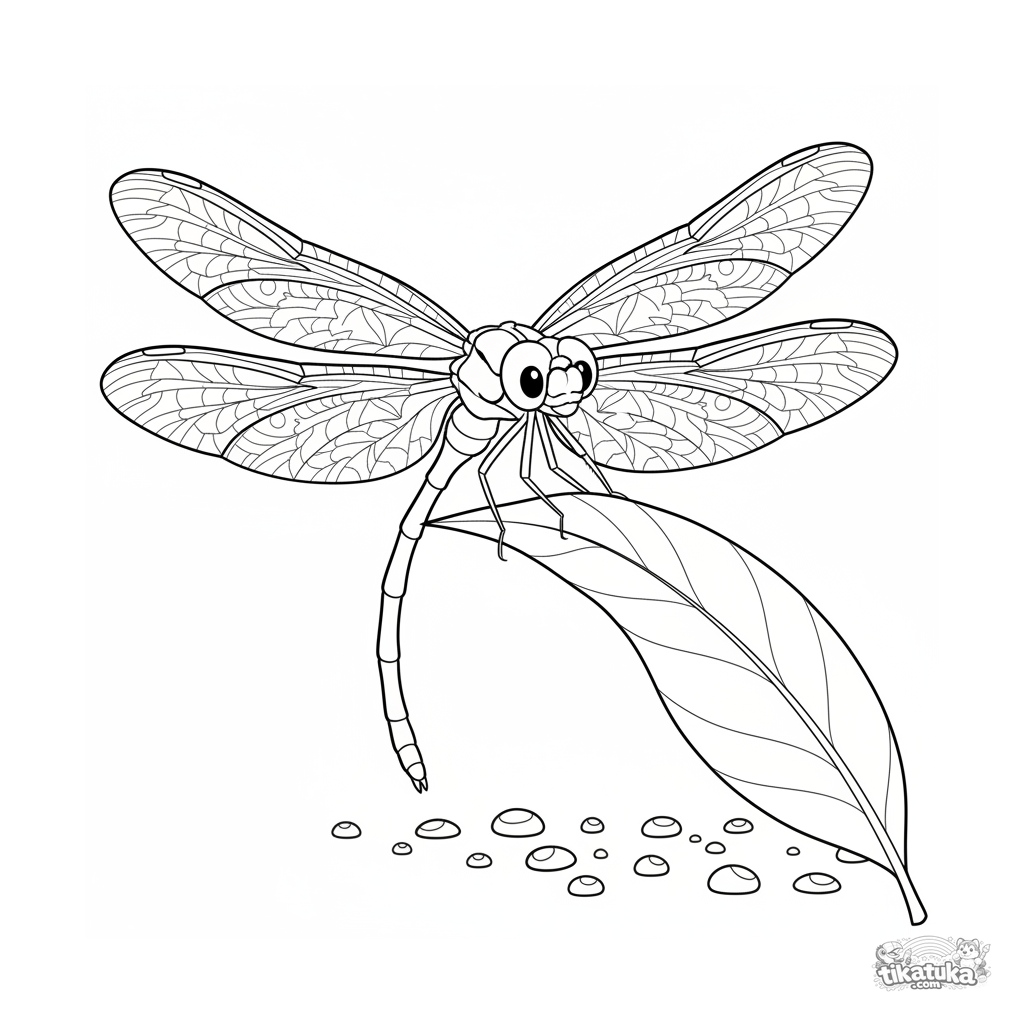 Detailed coloring page for ages 10-12: a dragonfly with lacy wing patterns perches on a leaf tip, guarding dewdrops. Realistic outlines, intricate patterns for careful coloring.