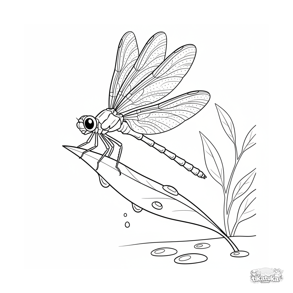 Coloring page for tweens 7-9: a dragonfly with patterned wings perches on a leaf tip above a dewy surface. Detailed field-guide outlines, moderate background.