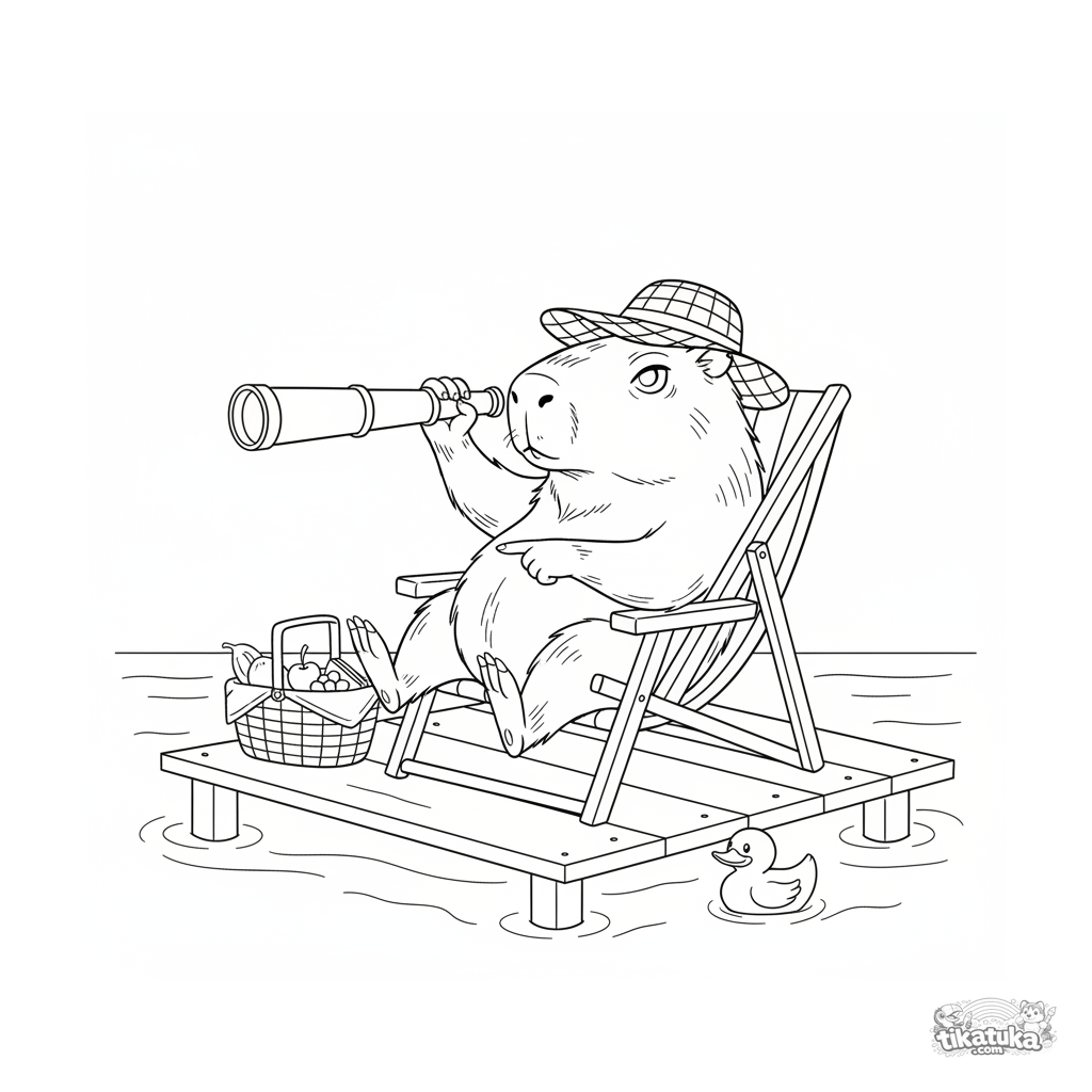 Coloring page for kids 10-12: a dramatic capybara in a deck chair on a pier, peering through a spyglass. Detailed funny scene in a realistic field-guide style.