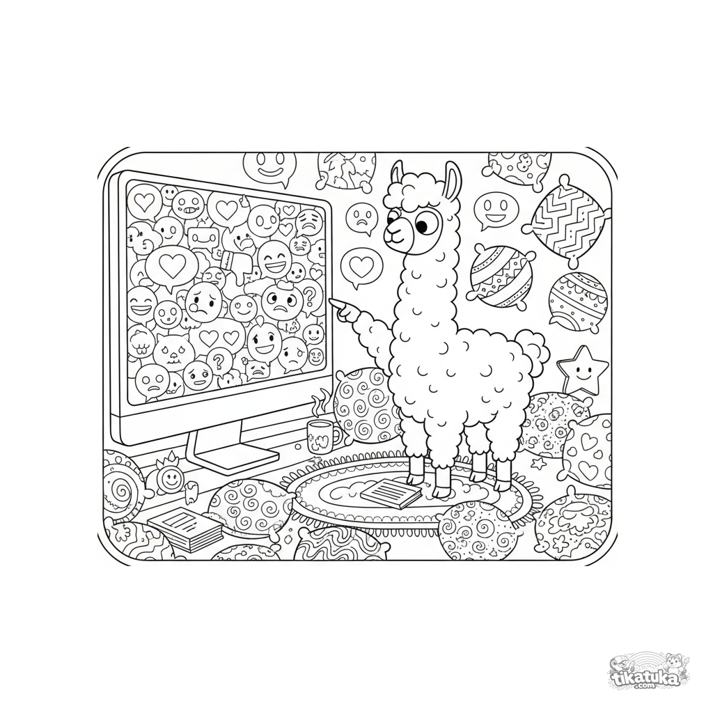 Coloring page for kids 7-12: a dramatic llama points at a chaotic chat on a huge monitor. A funny and detailed scene in comic-adventure style.
