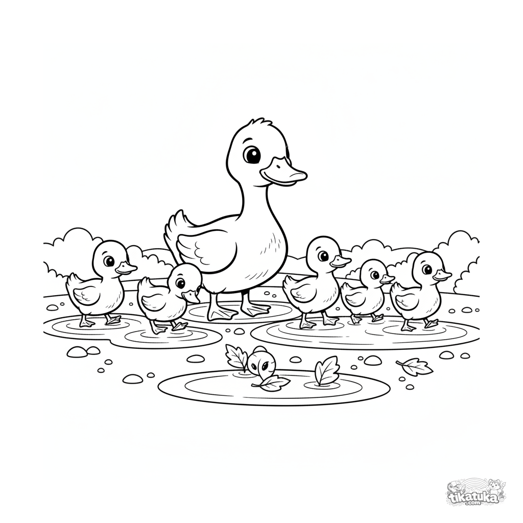 Coloring page for tweens 7-9: a mother duck leads a line of fluffy ducklings along a wet gravel path with puddles during a gentle autumn rain.