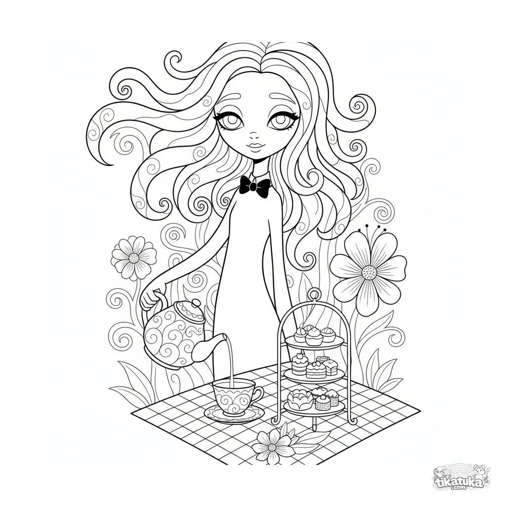 Coloring page for kids 7-9 years: an elegant art nouveau-style monster pouring tea at a fancy picnic. Flowing lines and decorative details.