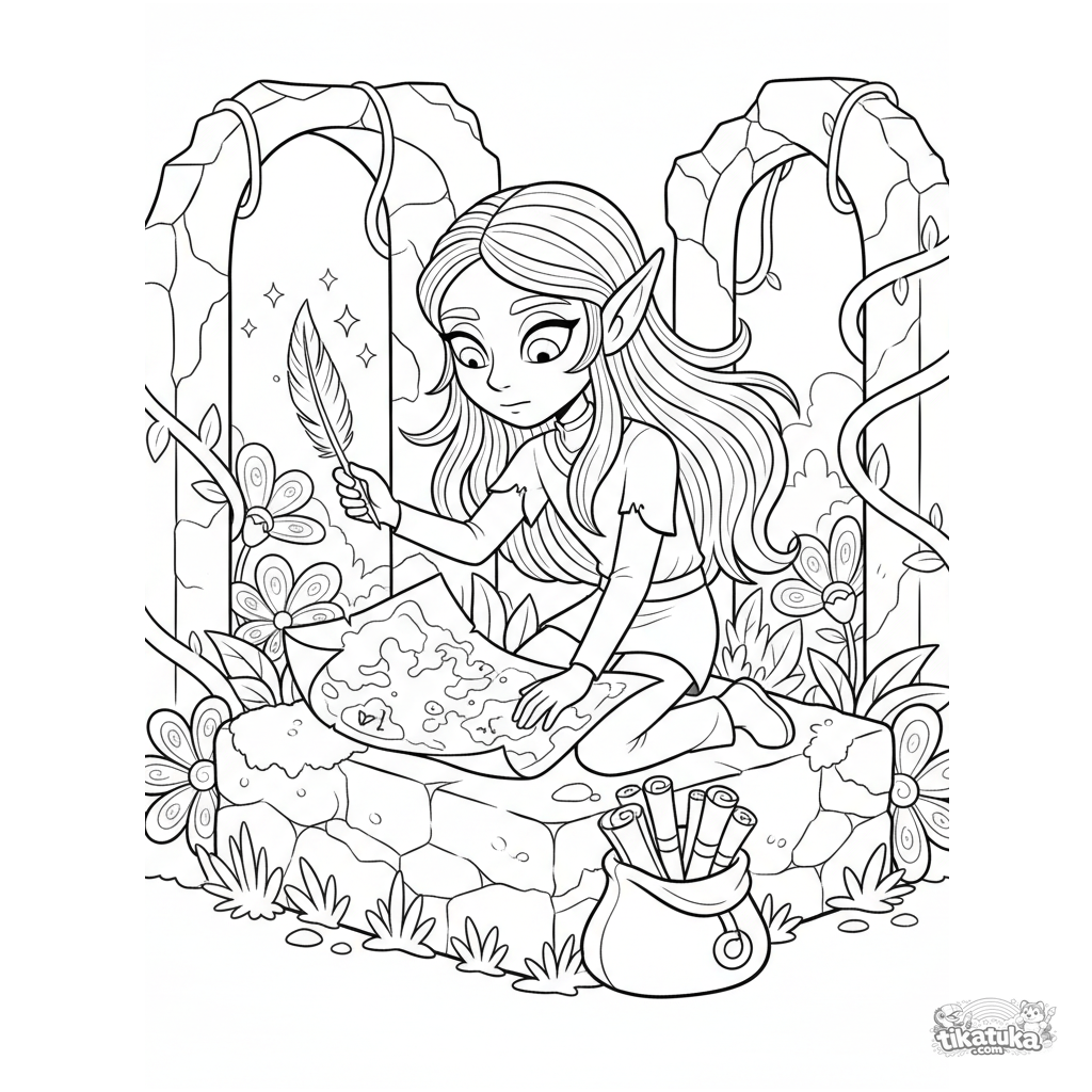 Coloring page for tweens 7-9: an elf cartographer sketches a map in overgrown ancient ruins. A fantasy scene with exploration and magical details.