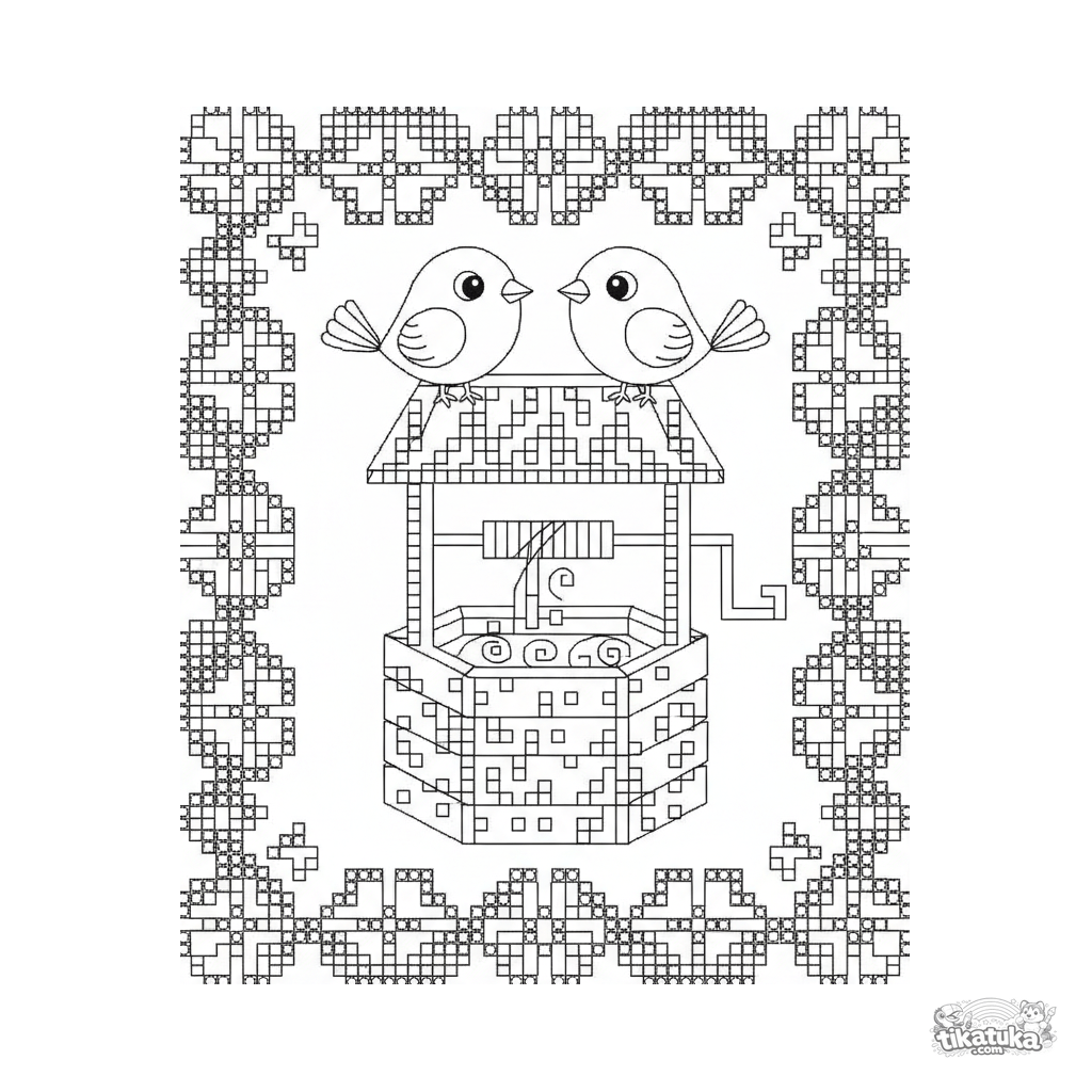 Complex pattern coloring page for kids 10-12 in cross-stitch style. Central motif is a well with birds, surrounded by a floral border.